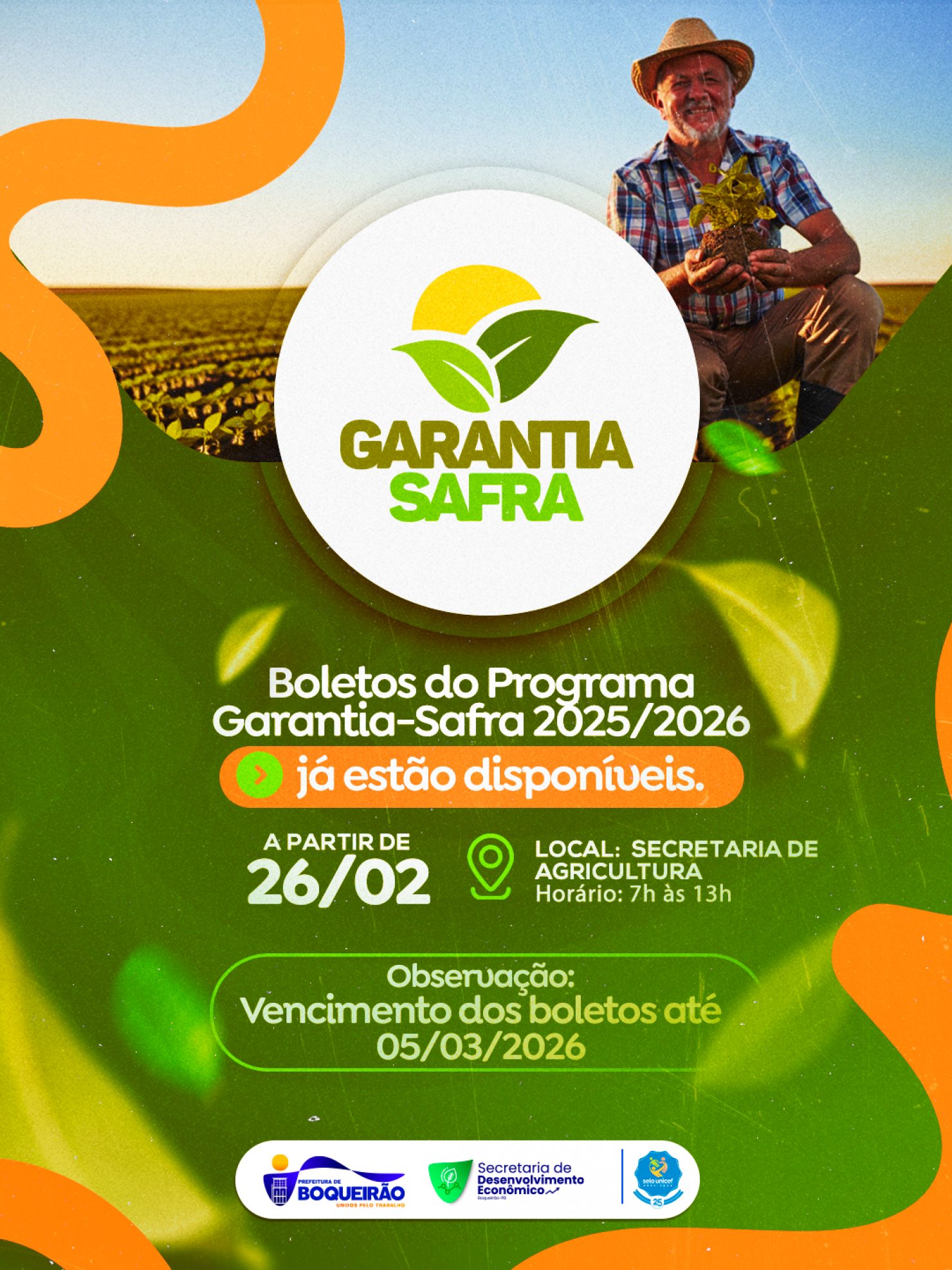 A Prefeitura de Boqueirão informa aos agricultores familiares que os boletos do Programa Garantia-Safra 2025/2026 já estão disponíveis para retirada.
