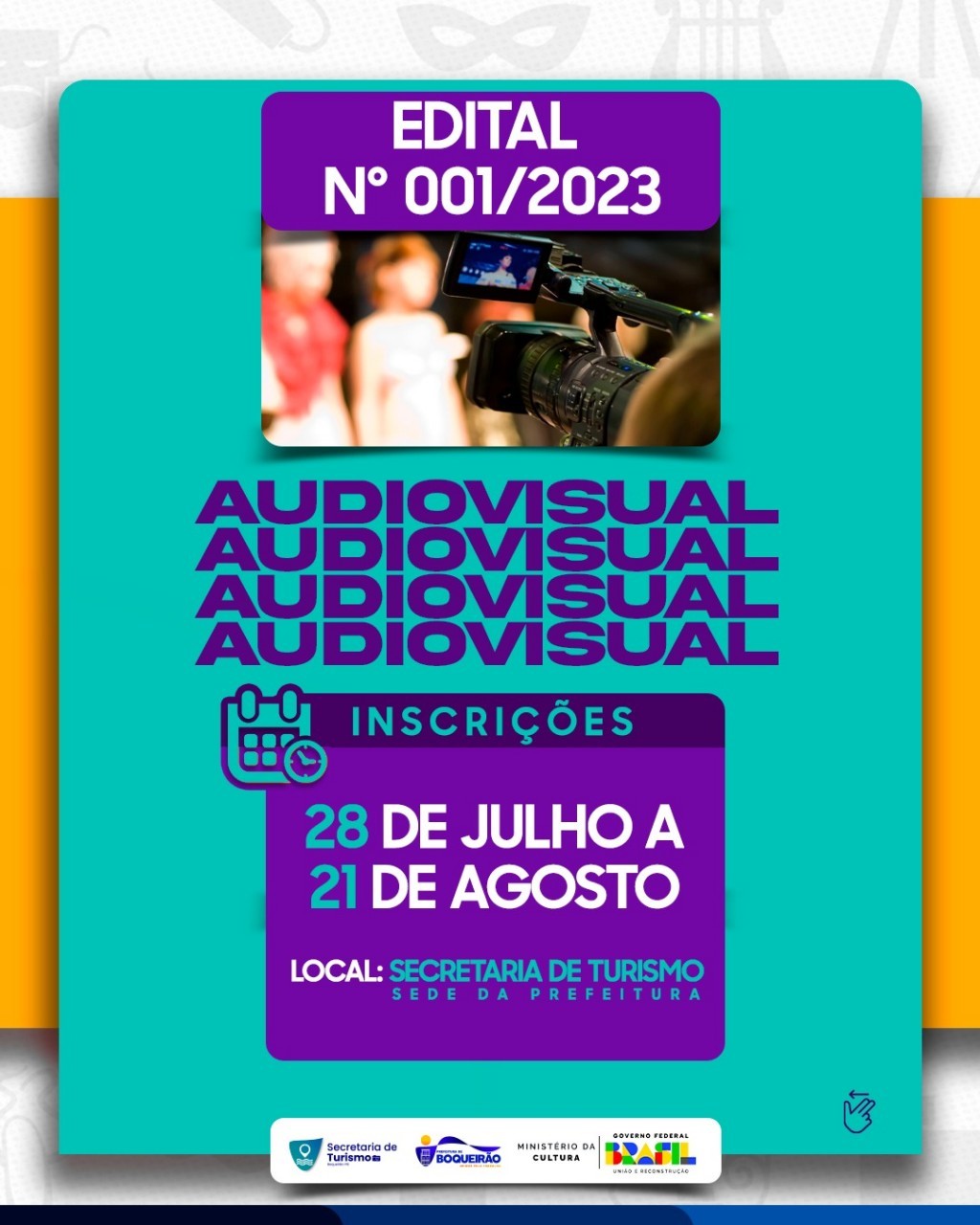 A Prefeitura Municipal de Boqueirão lança o Edital 001/2023 que regulamenta a seleção de projetos culturais no âmbito da “Lei Paulo Gustavo”, com o objetivo de garantir o incentivo e desenvolvimento de atividades culturais através do AUDIOVISUAL, incentivando a promoção e divulgação da arte e da cultura existente no nosso município.