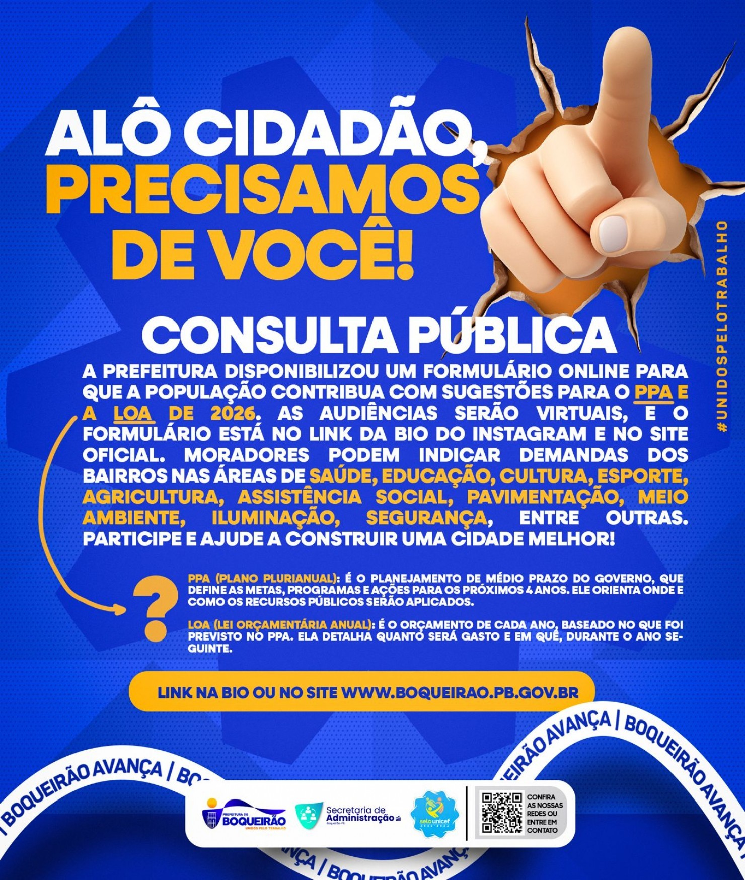 A Prefeitura Municipal de Boqueirão, por meio da Secretaria de Administração, disponibilizou um formulário online para que a população possa contribuir com sugestões e demandas voltadas à construção do Plano Plurianual (PPA) e da Lei Orçamentária Anual (LOA) para o ano de 2026.
